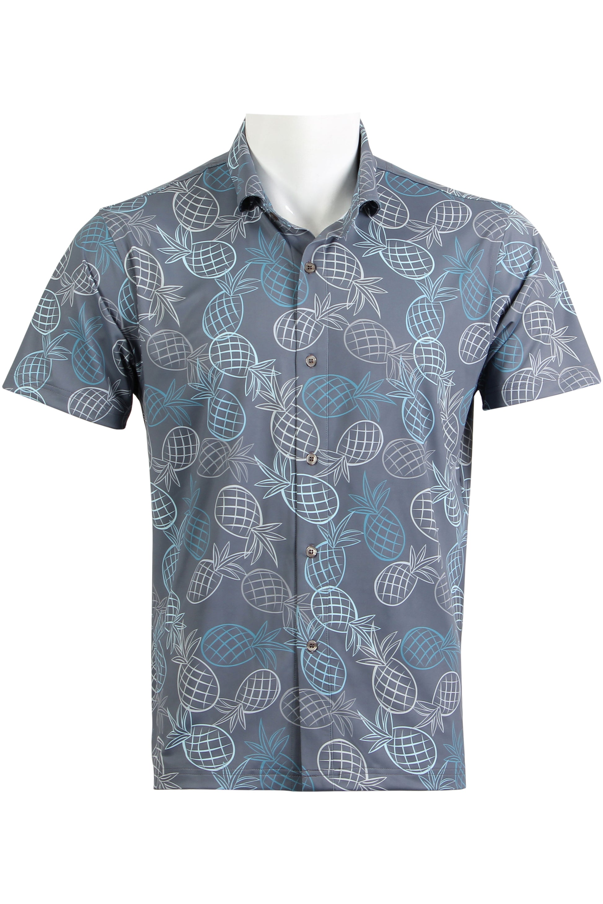 Our gray and blue mini pineapple button down shirt was designed for ultimate comfort and style, using the same comfy and innovative material as our classic polos.