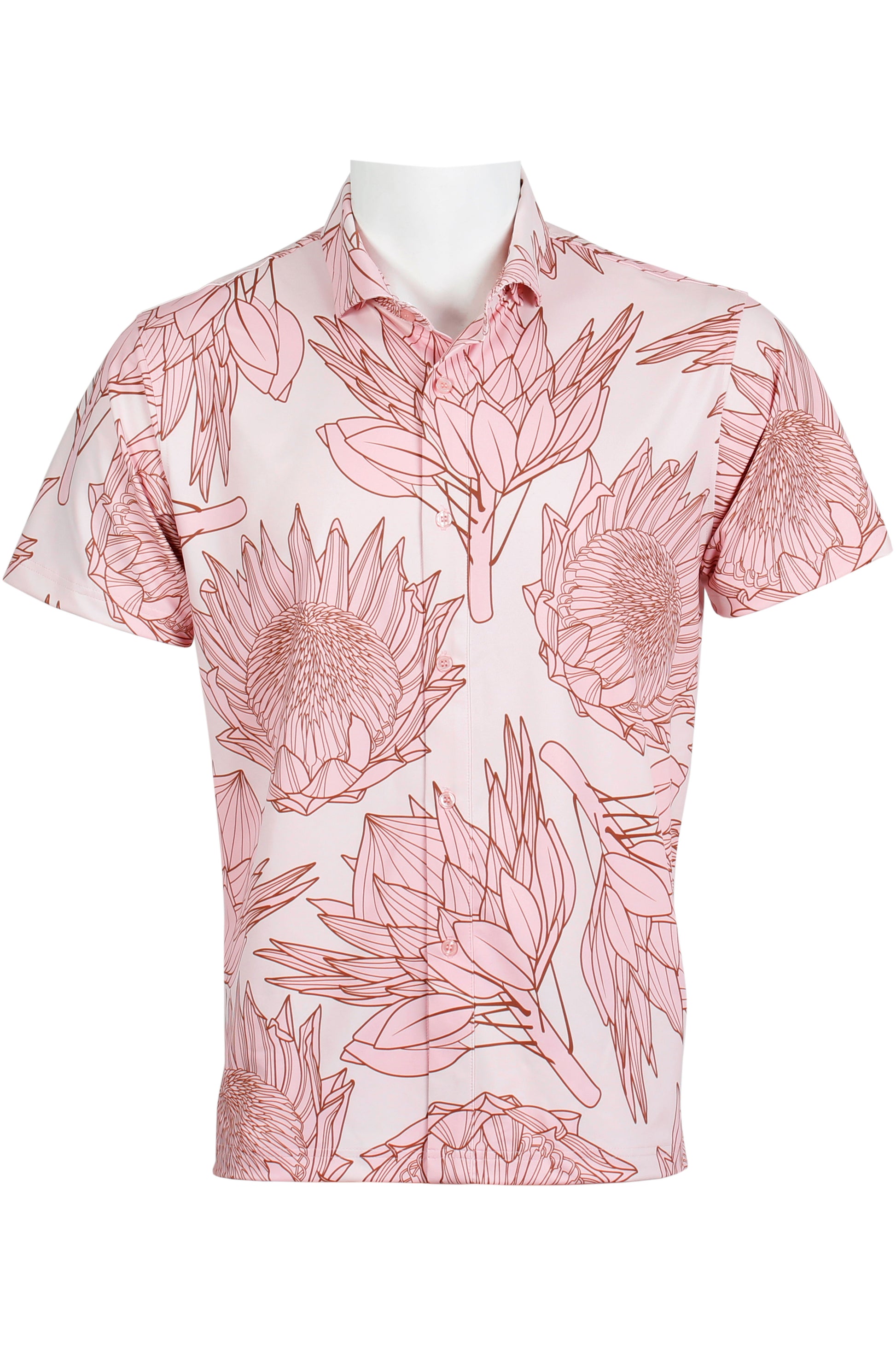 Our protea button down shirt in pink and copper was designed for ultimate comfort and style, using the same comfy and innovative material as our classic polos.