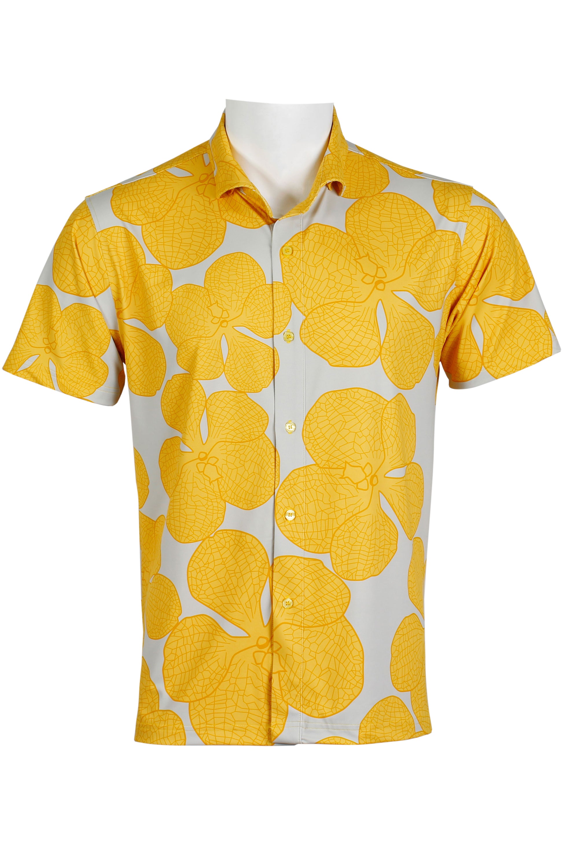 Our vanda orchid down shirt in gray and yellow was designed for ultimate comfort and style, using the same comfy and innovative material as our classic polos.